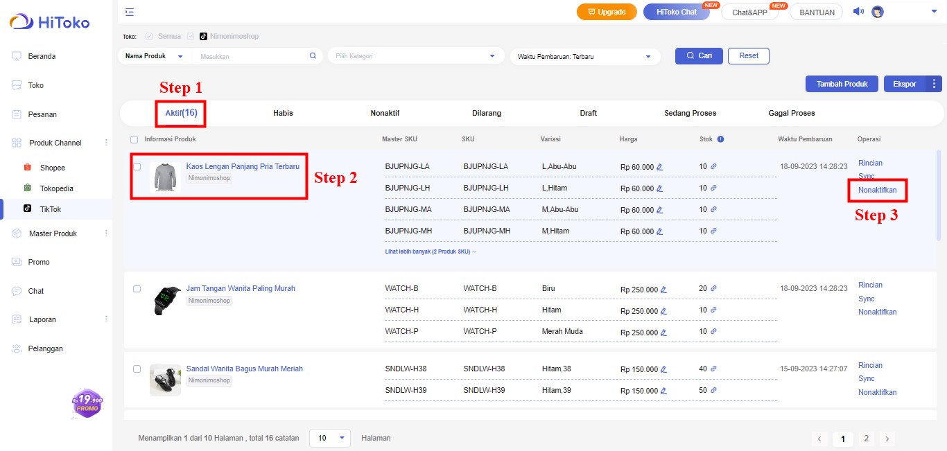 Klik Aktif > Pilih produk-produk yang ingin akan dinonaktifkan dengan cara mencentang kotak yang ada di depan setiap produk > Klik Nonaktifkan yang terdapat di bagian atas