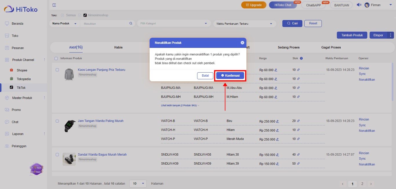 Langkah 3: Setelah itu, akan muncul pop up menu yang berisi pertanyaan apakah kamu yakin ingin menonaktifkan beberapa produk?Jika sudah yakin, klik Konfirmasi.